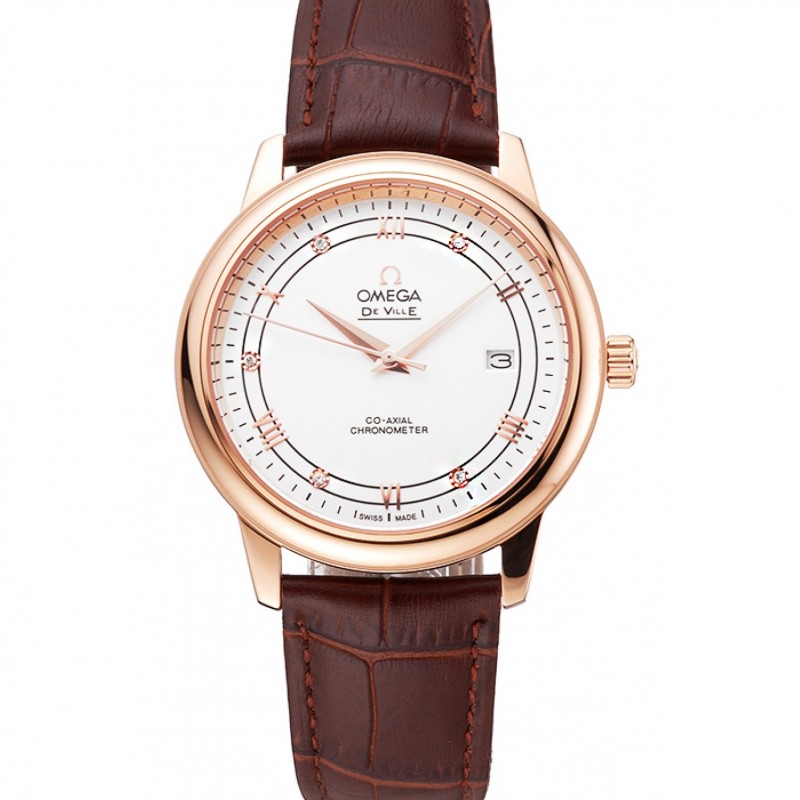 Lusso Orologi Replica Omega De Ville Prestige quadrante bianco cassa in oro rosa cinturino in pelle marrone