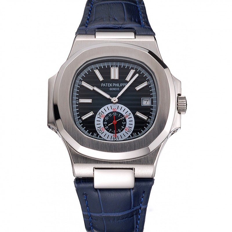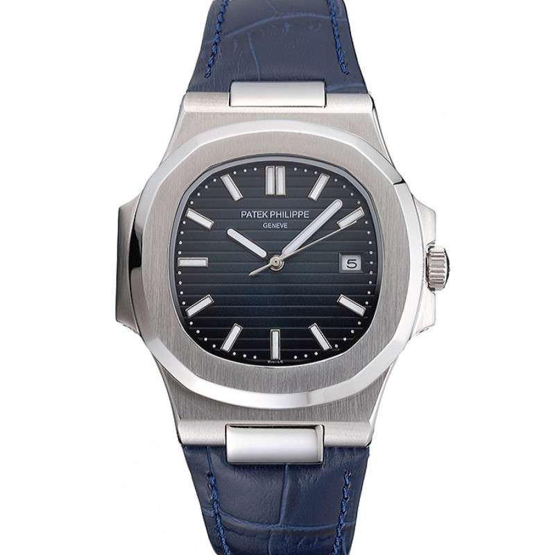 Patek Philippe Nautilus Quadrante Blu Cassa in acciaio Cinturino in pelle blu