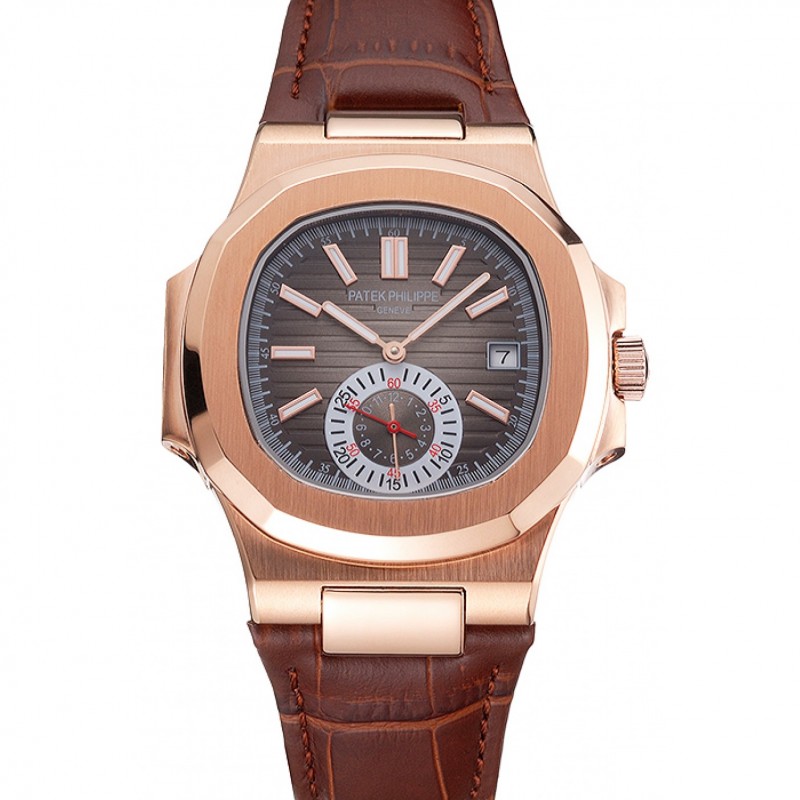 Patek Philippe Nautilus quadrante grigio cassa in oro rosa cinturino in pelle marrone