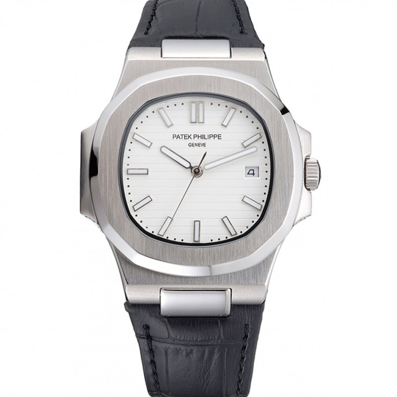 Patek Philippe Nautilus quadrante bianco spazzolato Cassa in acciaio nero cinturino in pelle