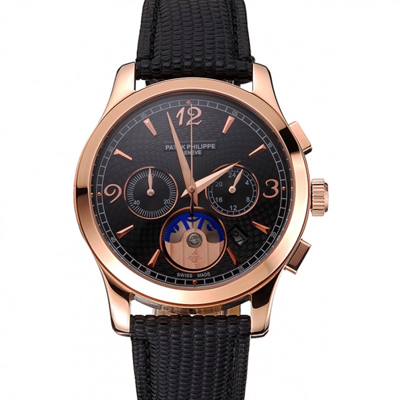 Patek Philippe Chronograph quadrante nero cassa in oro rosa cinturino in pelle marrone