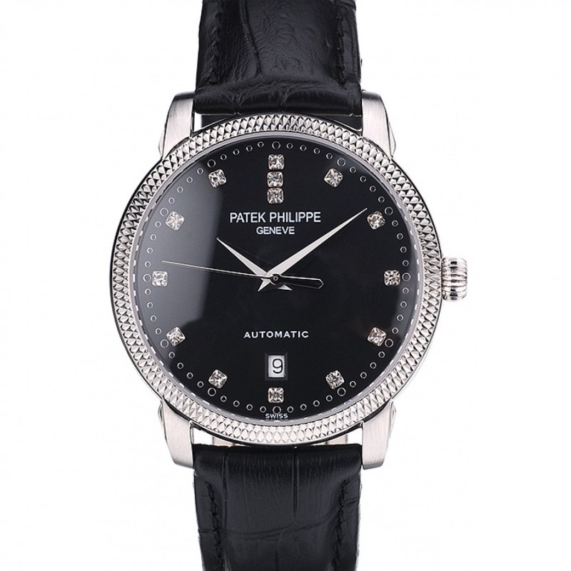 Patek Philippe Calatrava svizzero a coste lunetta quadrante nero cinturino in pelle nera 7661