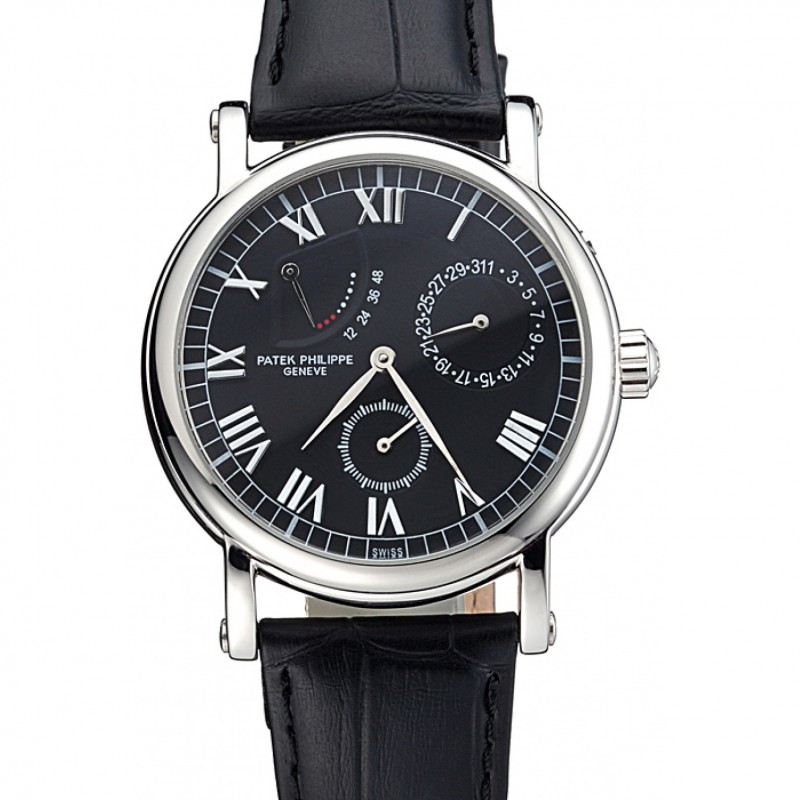 Lusso Complicazioni Patek Philippe Geneve quadrante nero lunetta in acciaio inossidabile nero della fascia del cuoio 622.141
