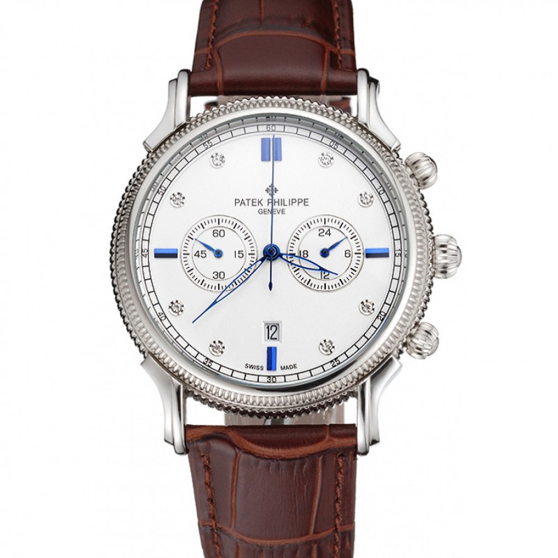 Eccellente Orologi Replica Patek Philippe Chronograph quadrante bianco con Diamante e cinturino in pelle blu Marcature cassa di acciaio inossidabile Brown