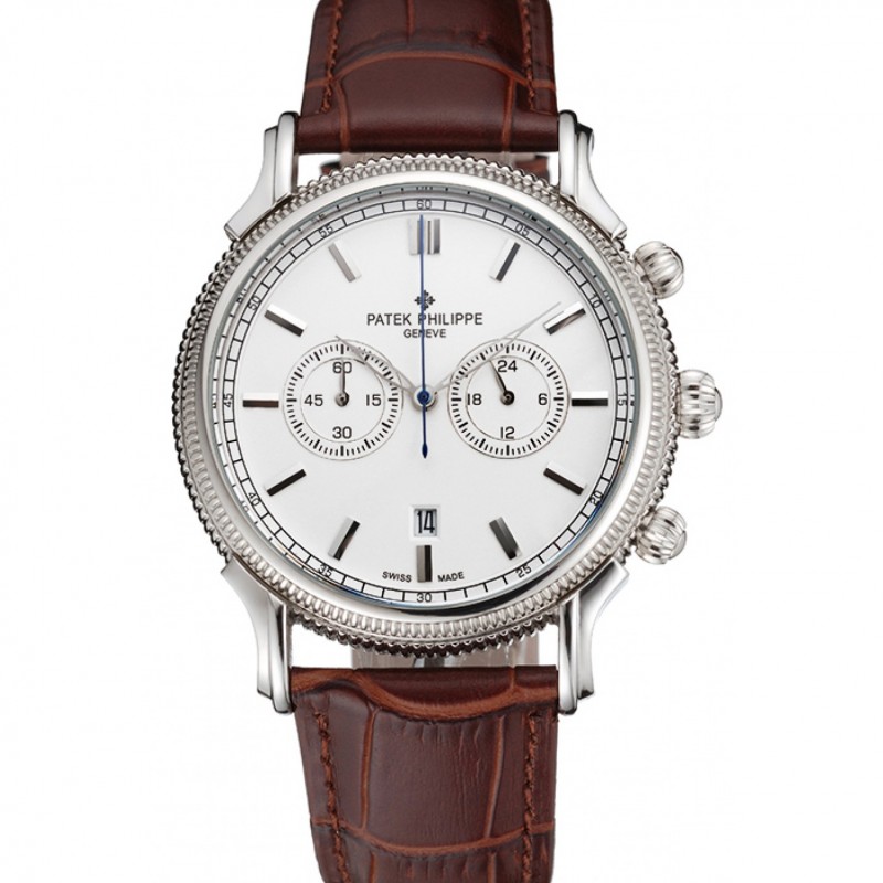 Patek Philippe Chronograph quadrante bianco Cassa in acciaio cinturino in pelle marrone