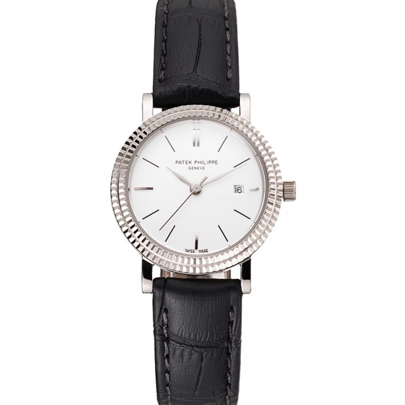 Patek Philippe Calatrava quadrante bianco doppio coste Lunetta Cassa in acciaio nero cinturino in pelle