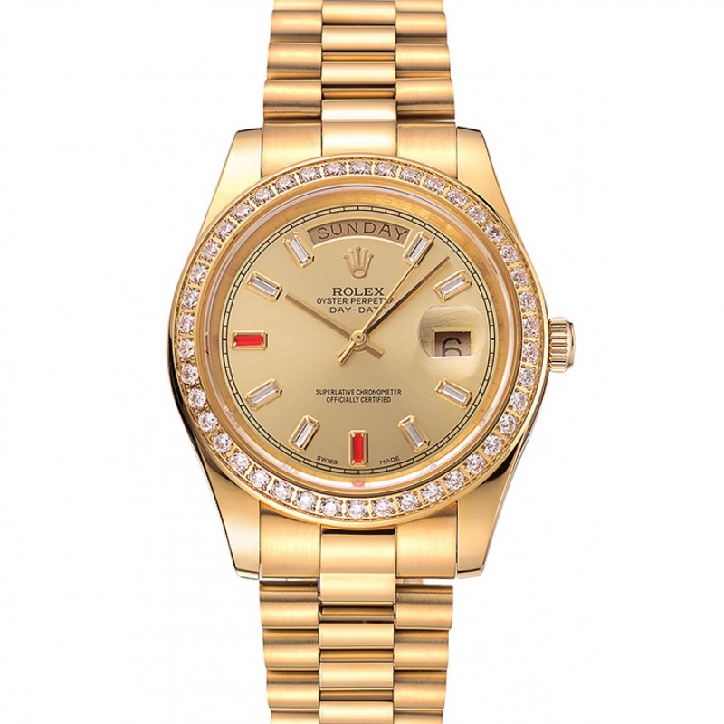 Lusso Orologi Replica Svizzero Rolex Day-Date diamanti e rubini Champagne quadrante in oro Bracciale 1454100