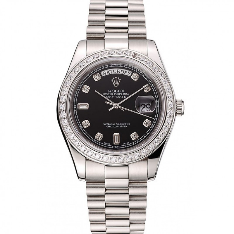Rolex Day-Date Svizzero quadrante nero braccialetto di diamanti cassa del diamante Numeri in acciaio inox 1453966