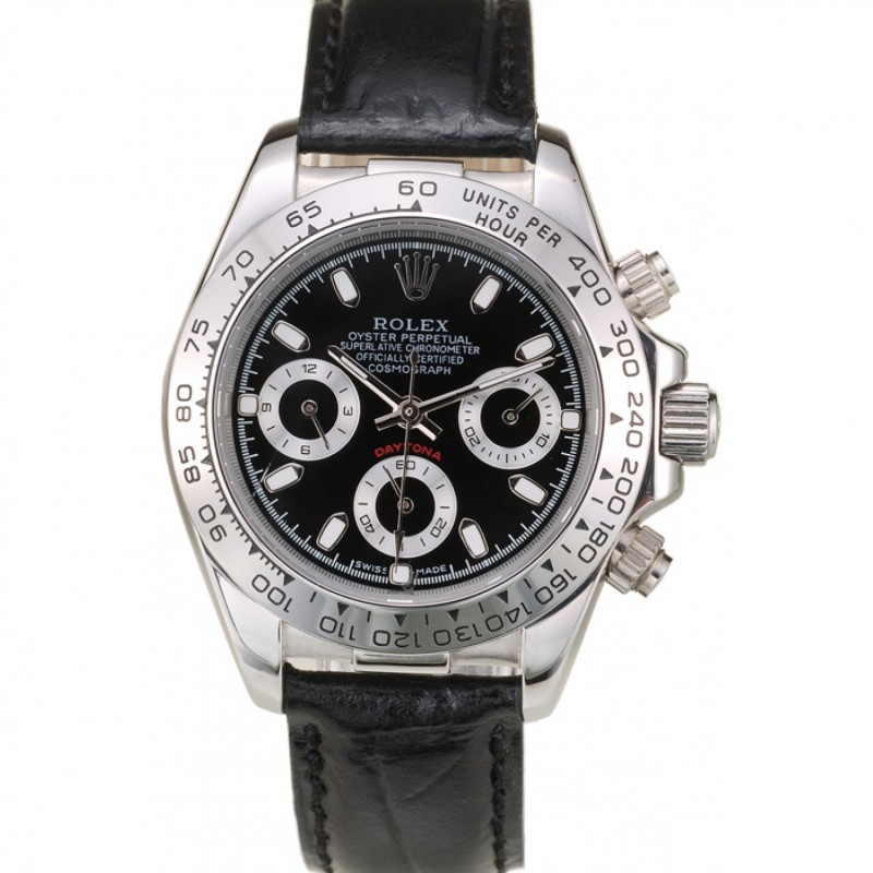 Rolex Daytona Lady Cassa in acciaio quadrante nero cinturino in pelle nera tachimetrica