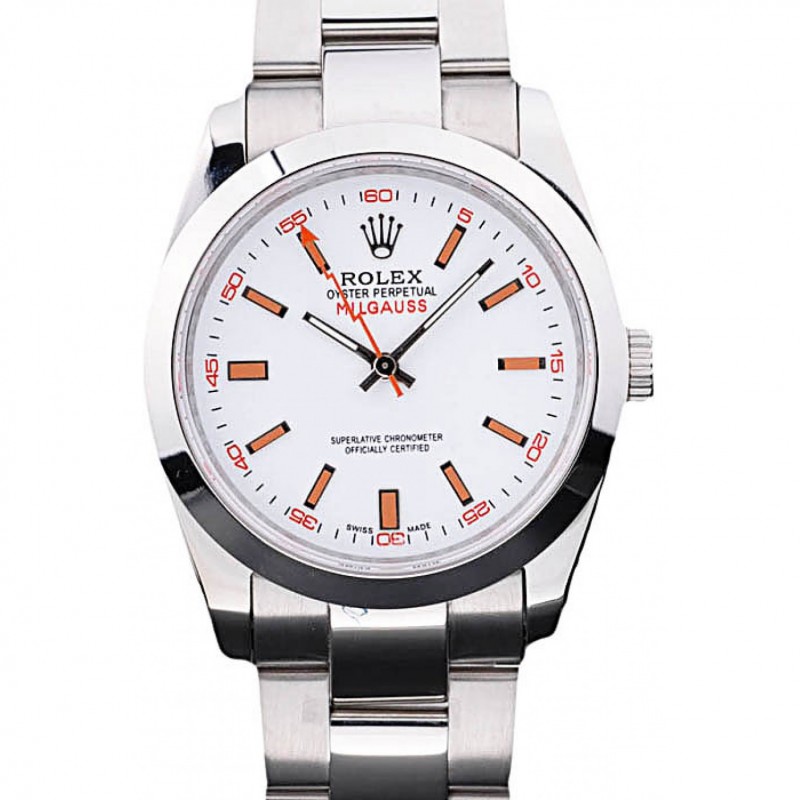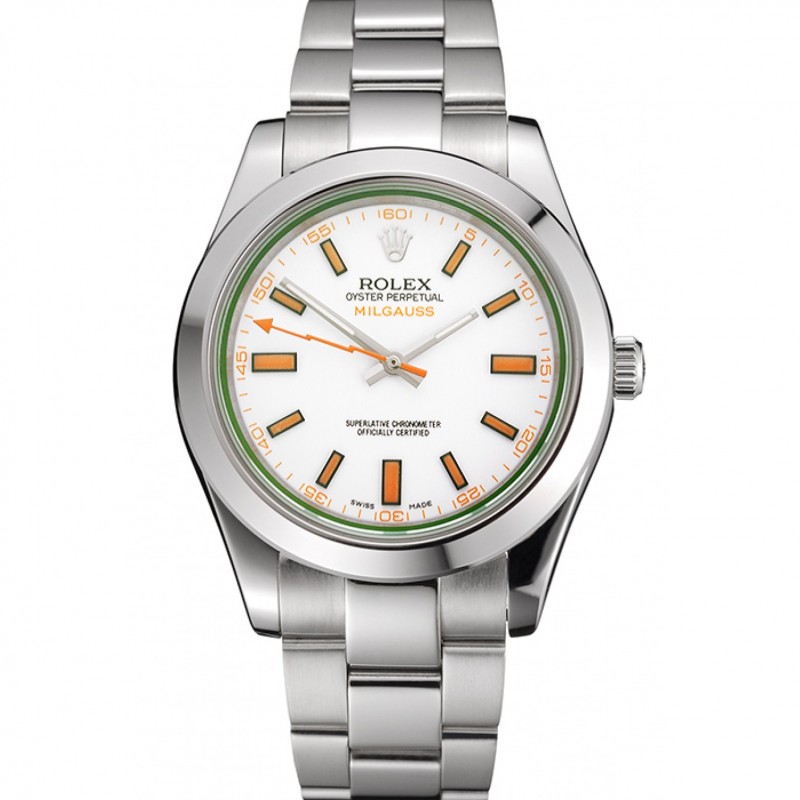 Eccellente Svizzero Rolex Milgauss Quadrante Bianco Cassa in acciaio arancione Marcature acciaio e bracciale