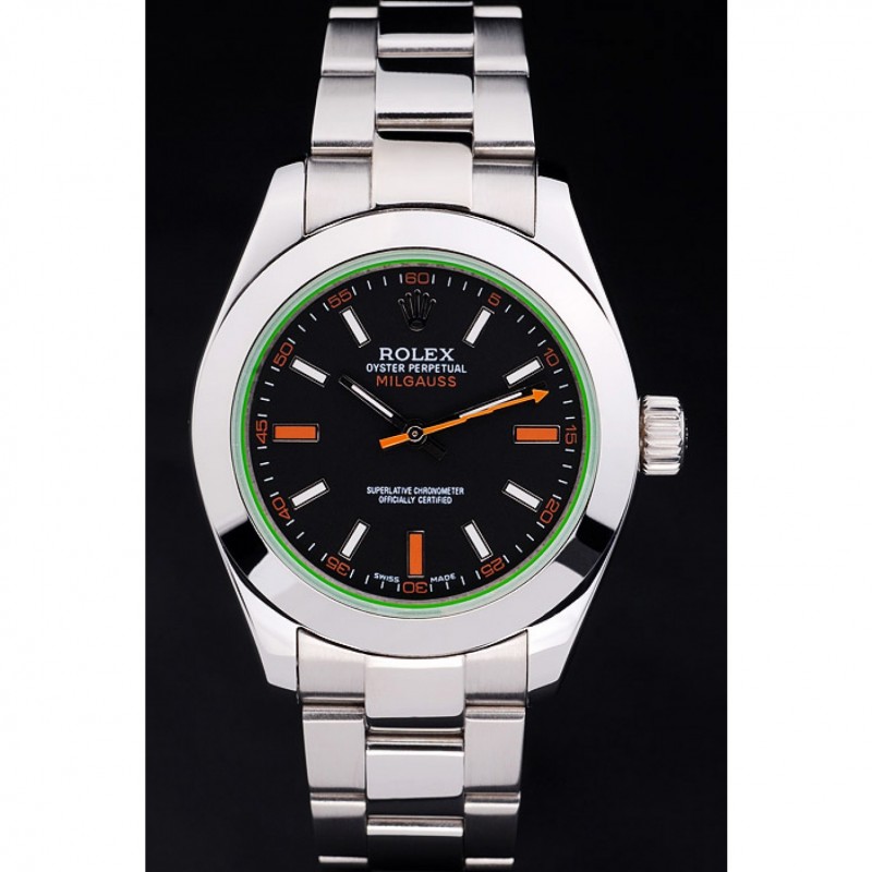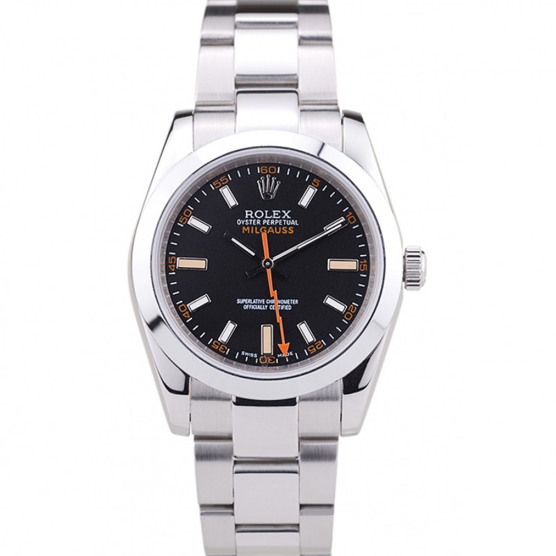 Svizzero Rolex Milgauss Quadrante Nero Cassa in acciaio arancione Marcature acciaio e bracciale