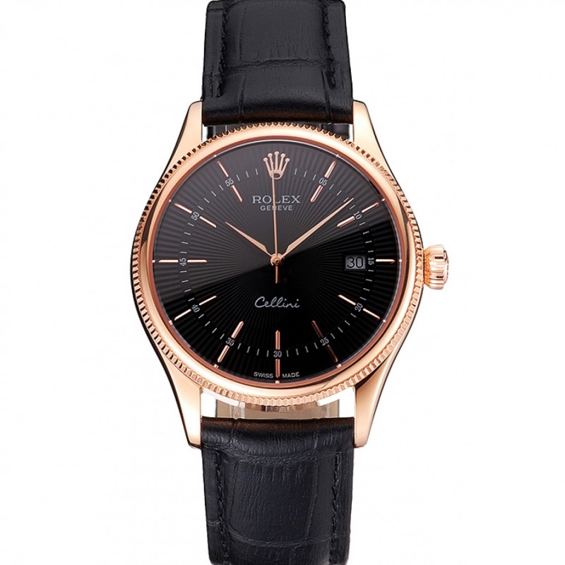 Svizzero Rolex Cellini Data quadrante nero oro rosa Marcature cassa in oro rosa nera Cinturino in pelle