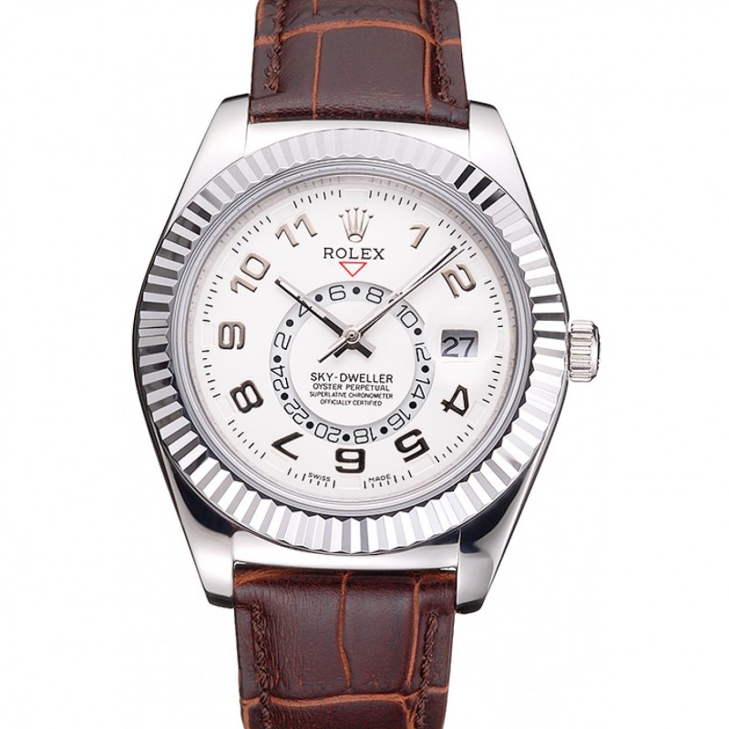 Rolex Sky Dweller quadrante bianco Cassa in acciaio cinturino in pelle marrone