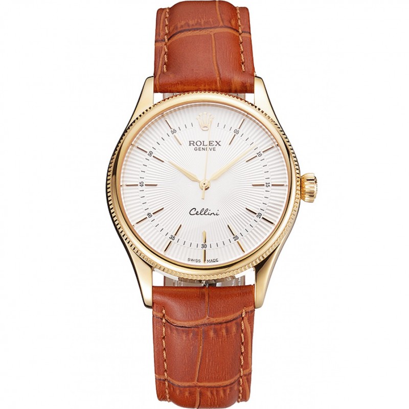 Svizzero Rolex Cellini bianchi guilloché cassa in oro chiaro cinturino in pelle marrone