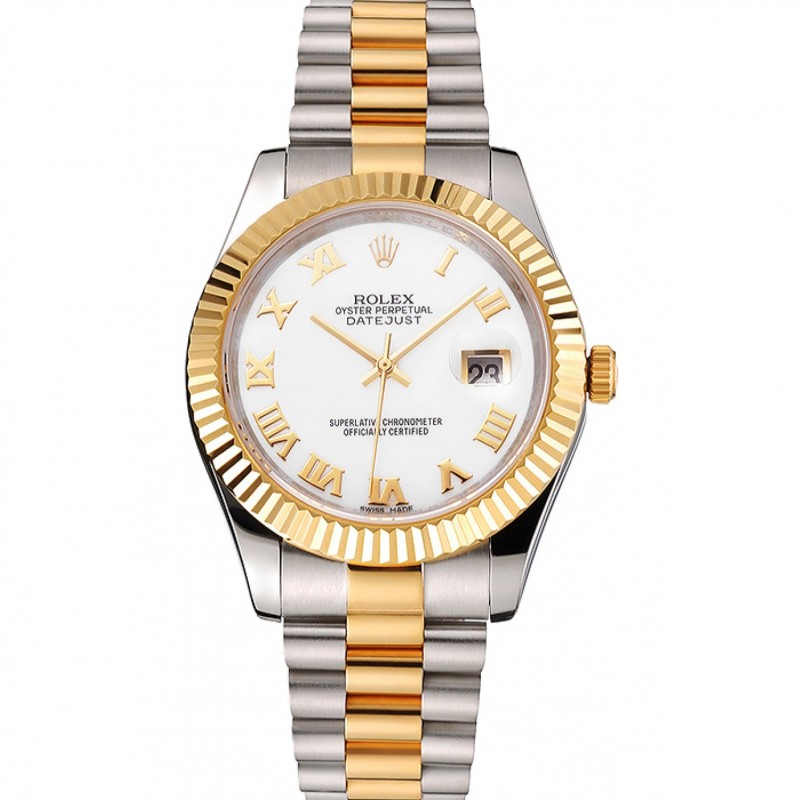 Lusso Orologi Replica Rolex Datejust quadrante bianco numeri romani lunetta in oro Cassa in acciaio Bracciale in Two Tone