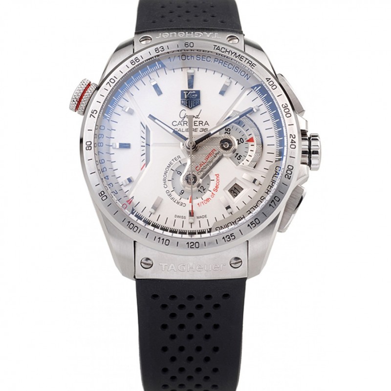 TAG Heuer Carrera svizzero tachimetrica Lunetta perforato nero con cinturino in gomma quadrante bianco