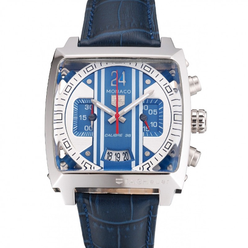 Migliore Orologi Replica Tag Heuer Monaco Calibre 24 Chronograph 36 blu e grigio Stripes Quadrante Blu Cinturino in pelle 622.273