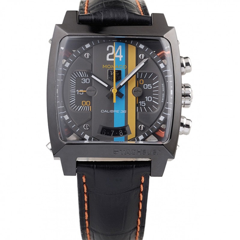Tag Heuer Monaco Calibre 36 blu e arancione Stripes pelle Quadrante nero Cinturino 622.302