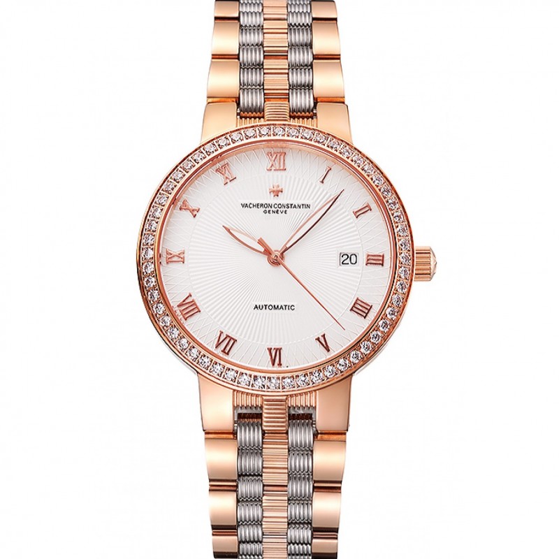 Svizzero Vacheron Constantin Traditionnelle quadrante bianco Diamond Bezel cassa in oro rosa Bracciale Two Tone