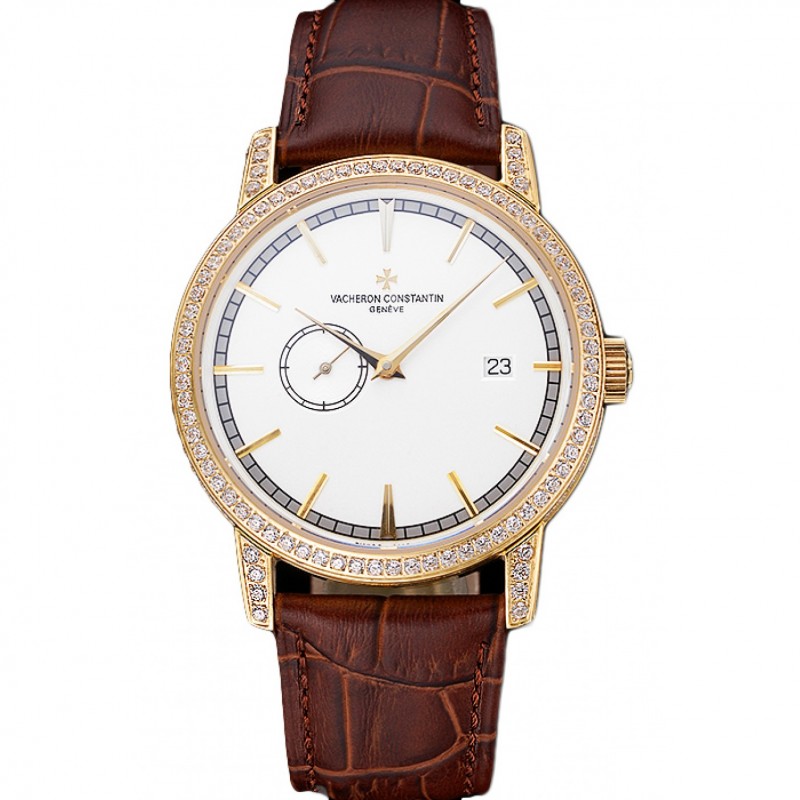Svizzero Vacheron Constantin Patrimony Contemporaine Gold Diamond Custodia quadrante bianco in pelle marrone Bracciale 622.686