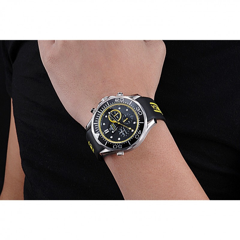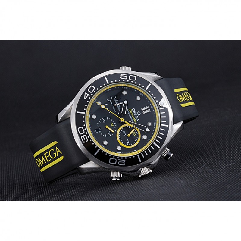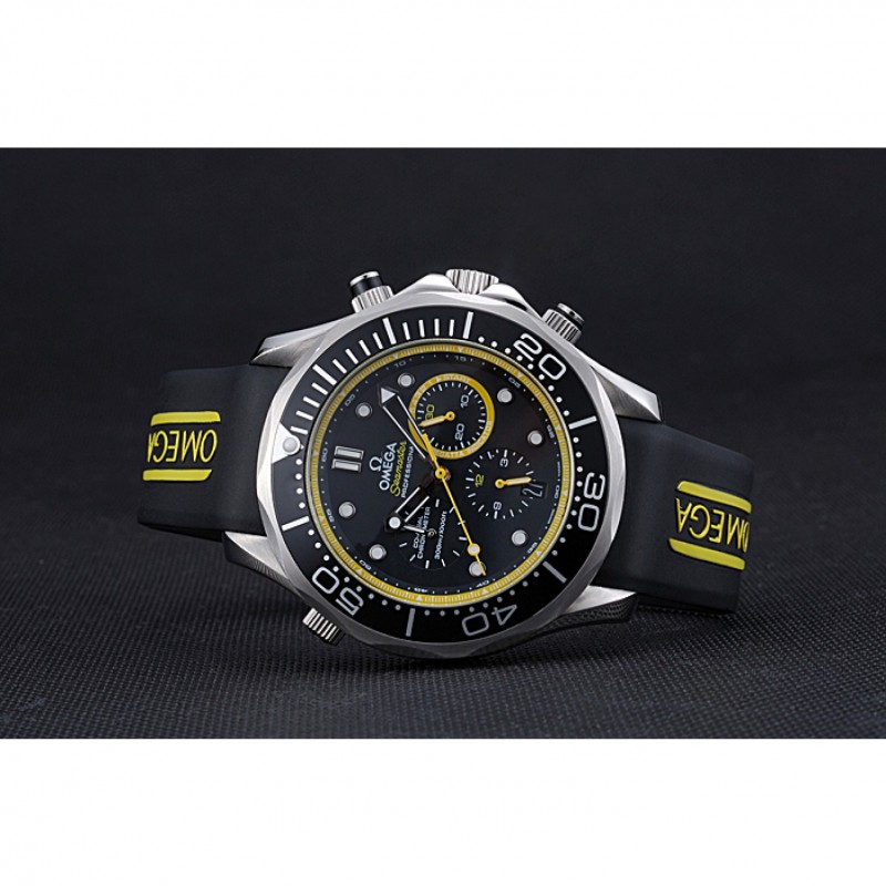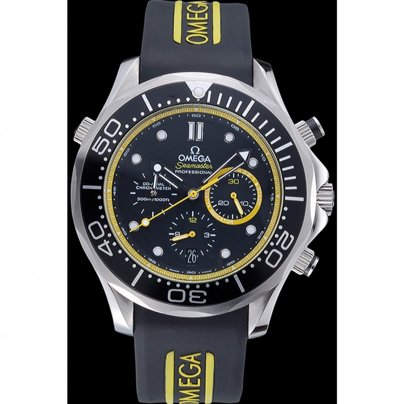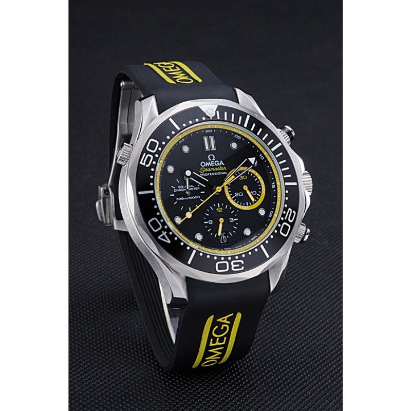 Corona : Omega logo inciso lucido corona intaglio in acciaio inossidabile con la striscia di smalto nero pulsante rotondo corona su entrambi i lati di esso, più un logo inciso lucido corona intaglio in acciaio inox in alto a fronte