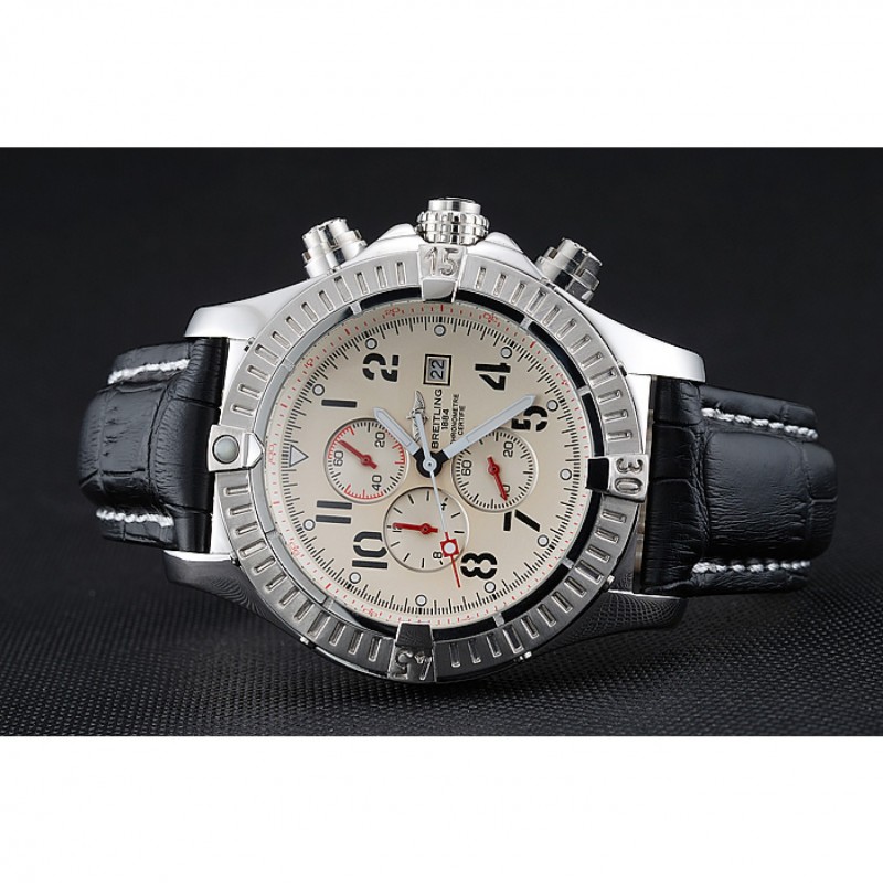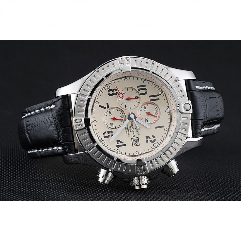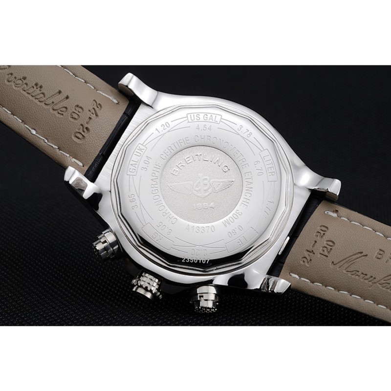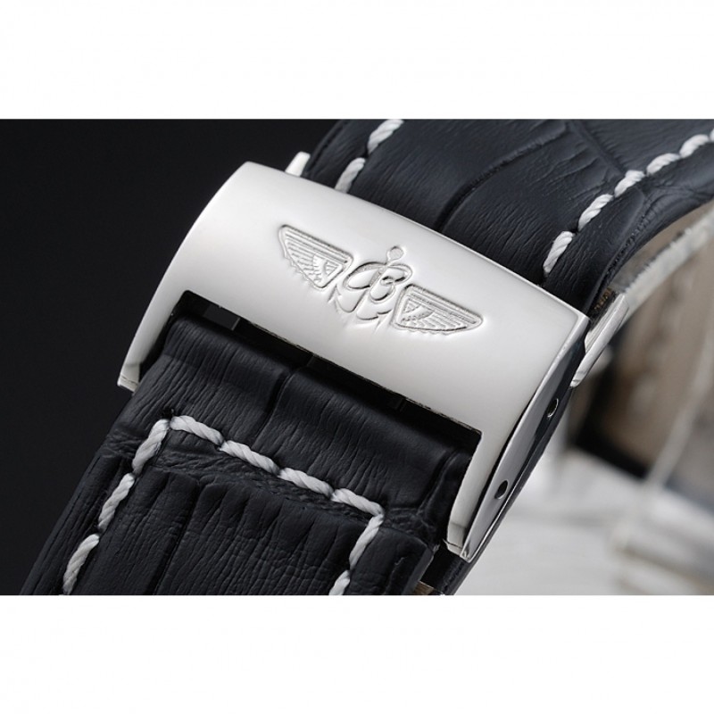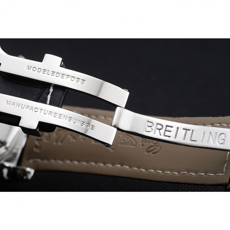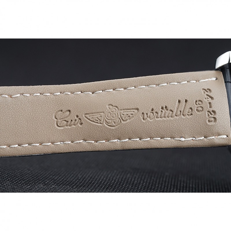 Bracciale:. nero pelle di alta qualità in un modello di coccodrillo, con pesanti cuciture in cotone bianco. fascia interna Tan è in rilievo con il nome Breitling e il logo, e ha una fibbia in acciaio