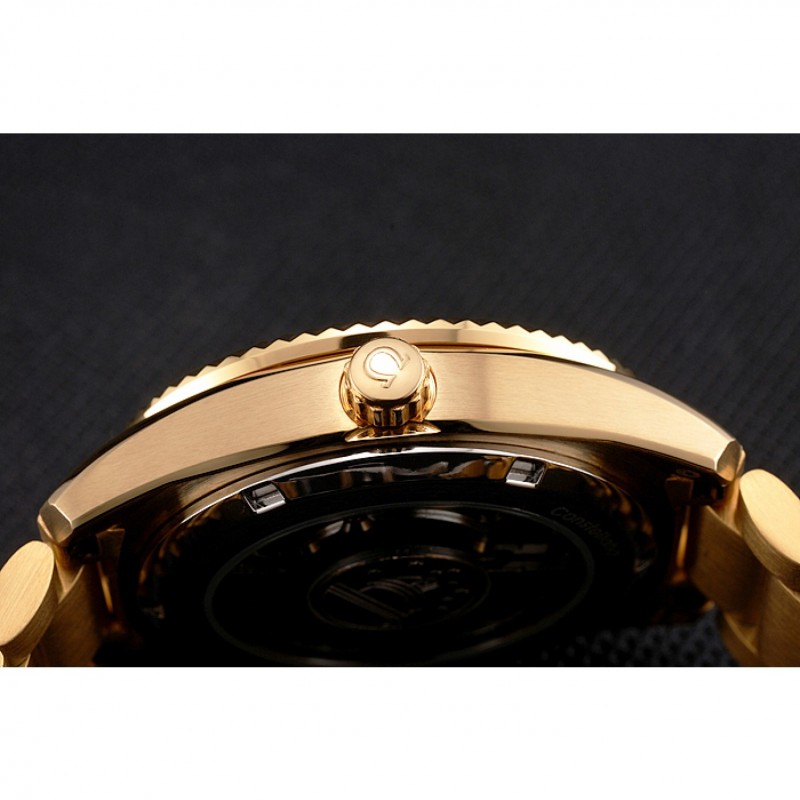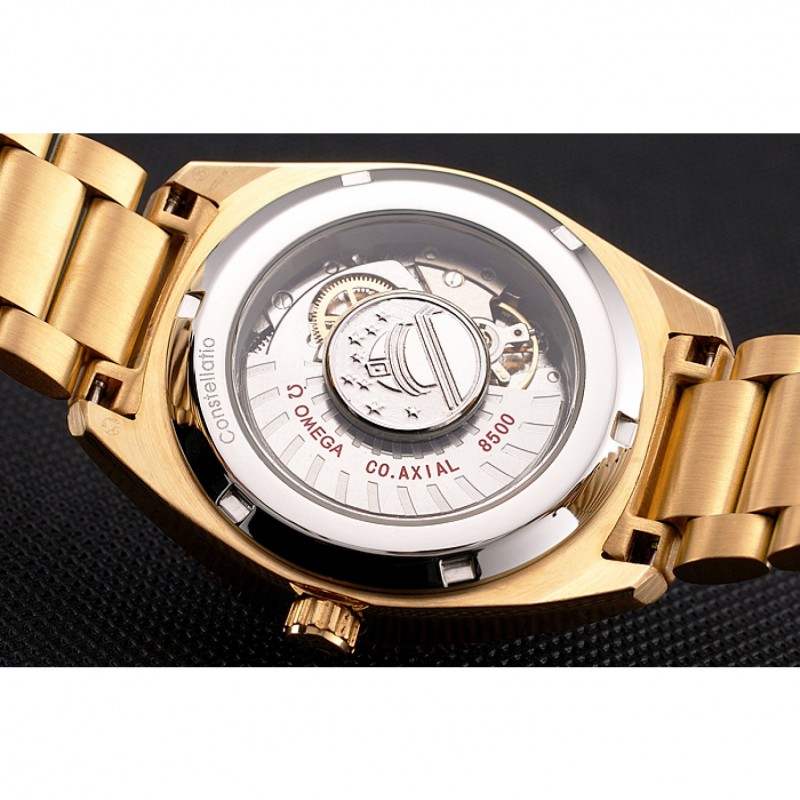 Torna: trasparente meccanica-rivelando indietro con un acciaio inossidabile lucidato snap-in cerchione e Omega iscrizione