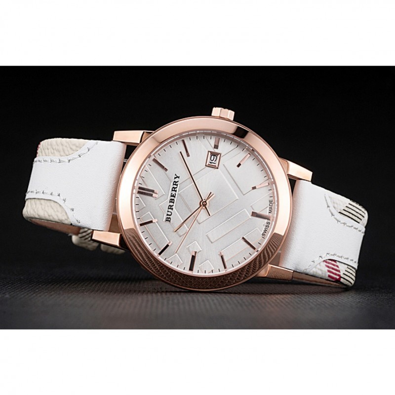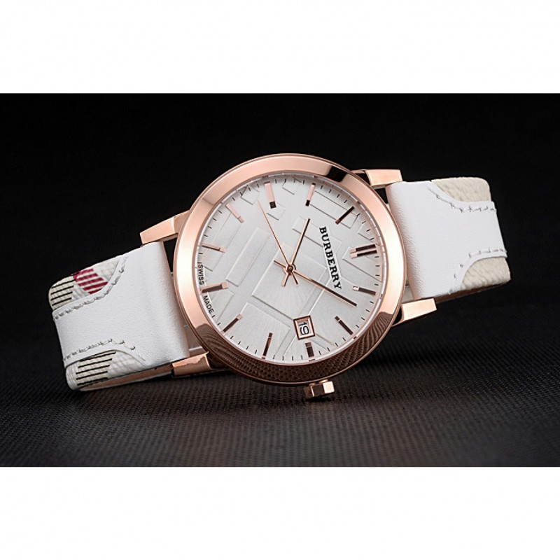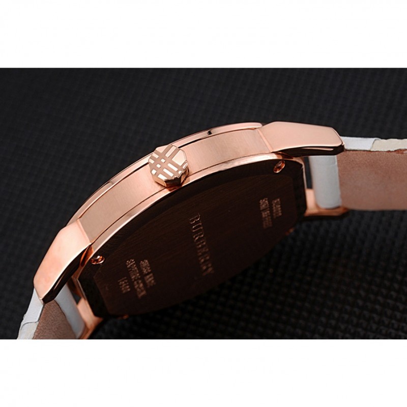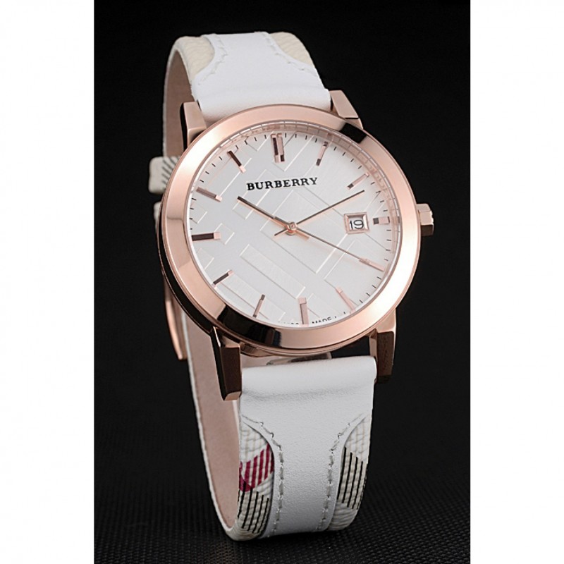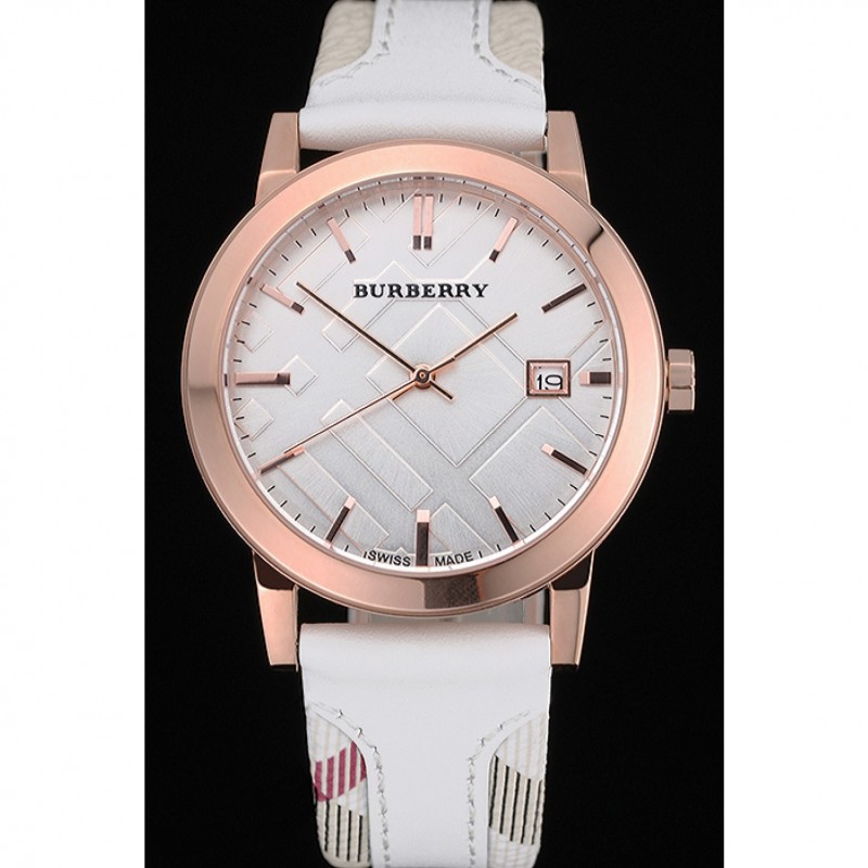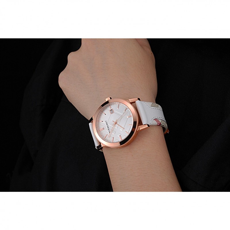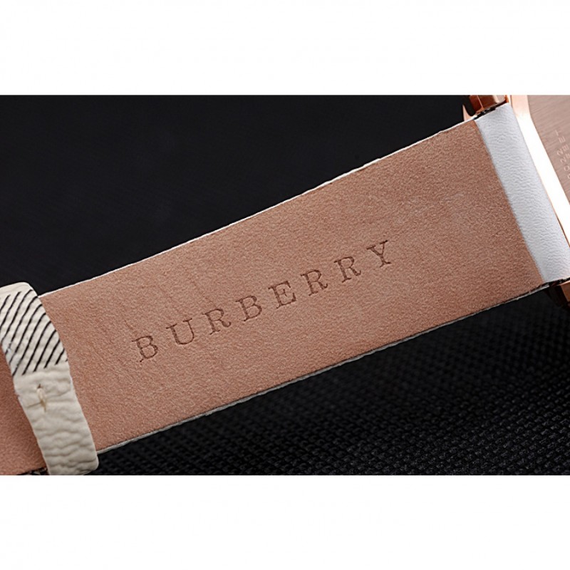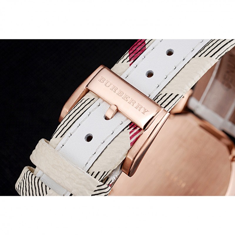 braccialetto: Burberry calore goffrato cinturino in pelle bianca con Burberry pelle stampa a scacchi tagliare lungo i bordi e Burberry inciso 18k oro rosa placcato gancio fibbia chiusura