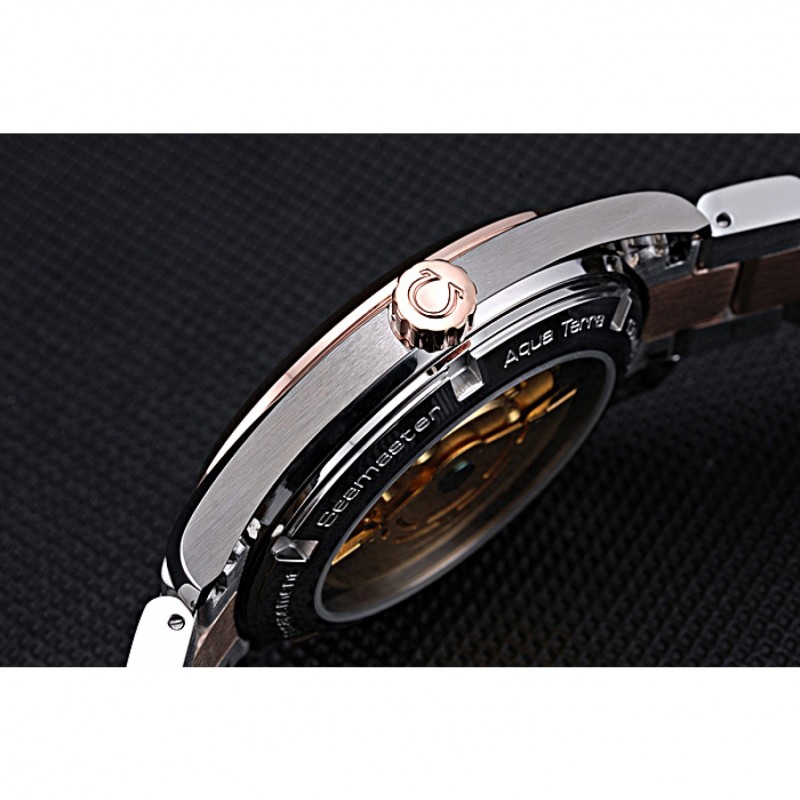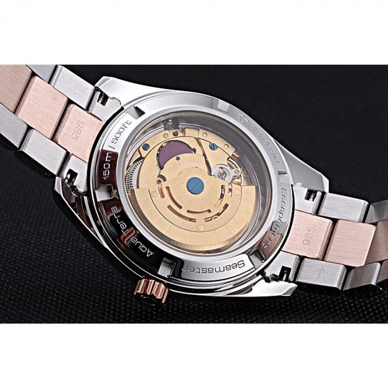 Torna: in acciaio inox lucido snap-in indietro con la meccanica trasparenti rivelando centro e incisione Omega Seamaster