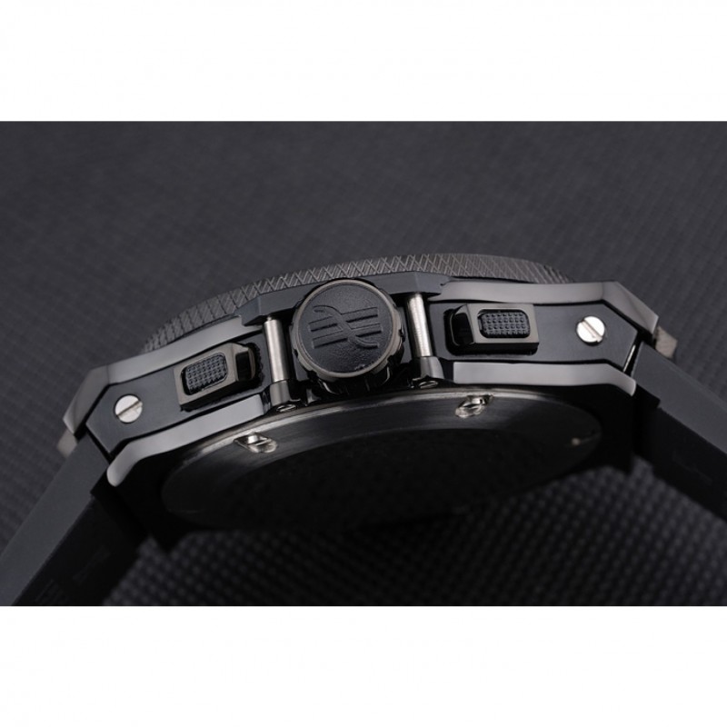 Crown: Cutwork corona ione-placcato con incisione ‘H’ e due rettangolari corone a pulsante su entrambi i lati, fissato con guarnizioni in gomma nero e rosso