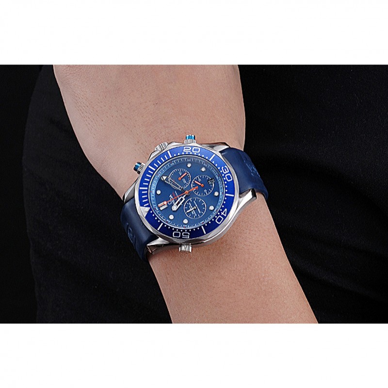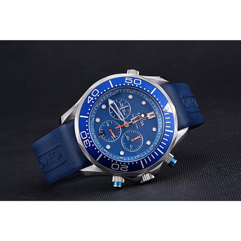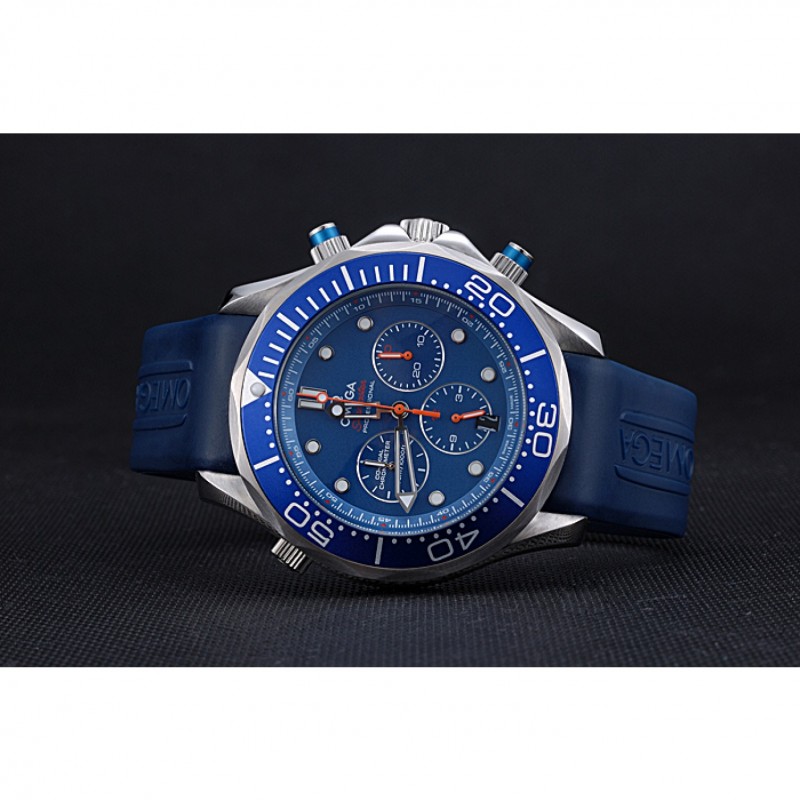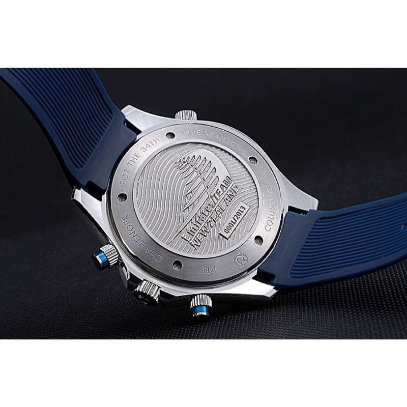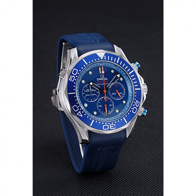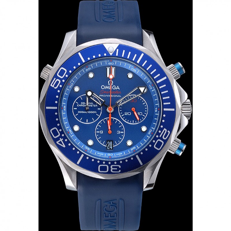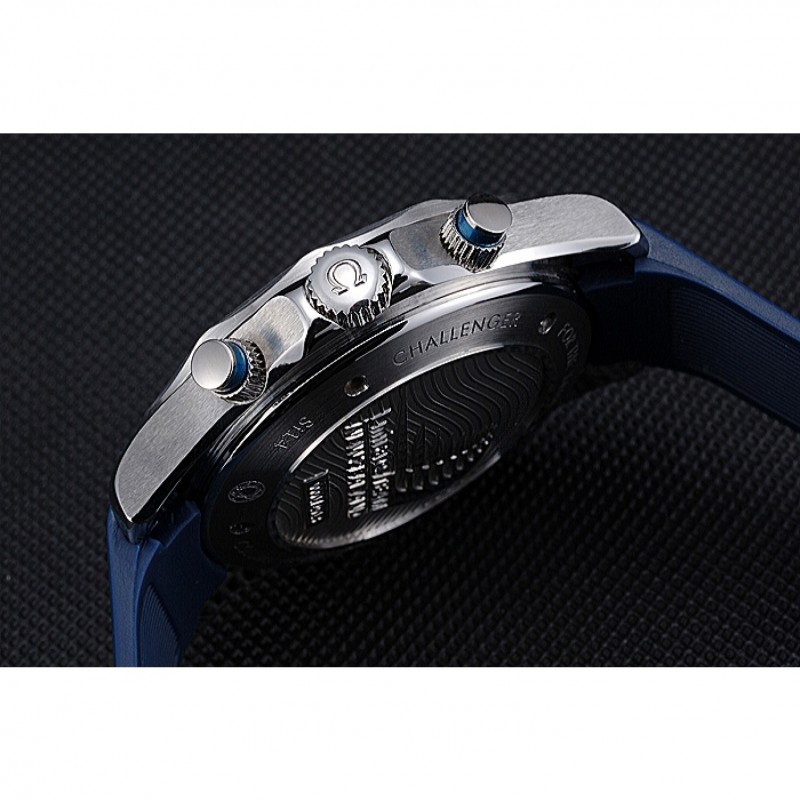 corona: Omega logo inciso lucido corona intaglio in acciaio inossidabile con la striscia di smalto blu pulsante rotondo corona su entrambi i lati di esso, più un logo inciso lucido corona intaglio in acciaio inox in alto a fronte