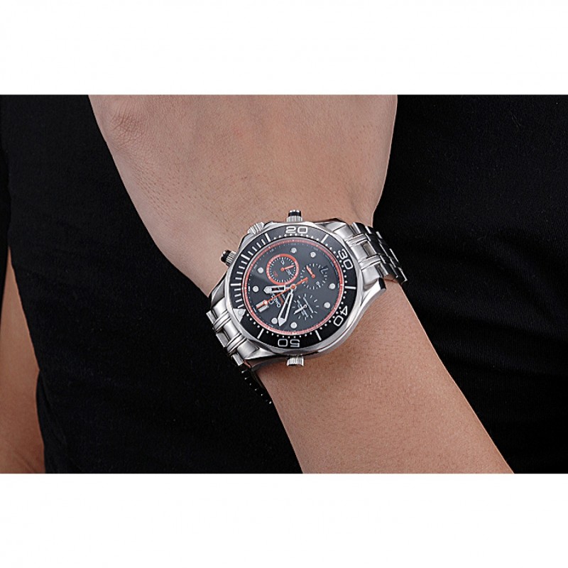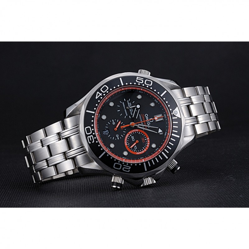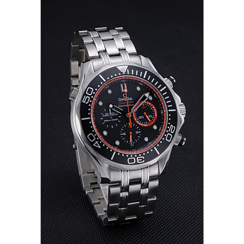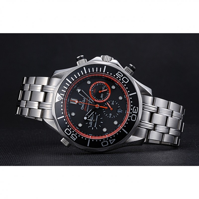Corona: Omega logo inciso lucido corona intaglio in acciaio inossidabile con la striscia di smalto nero pulsante rotondo corona su entrambi i lati di esso, più un logo inciso lucido corona intaglio in acciaio inox su all’angolo opposto top