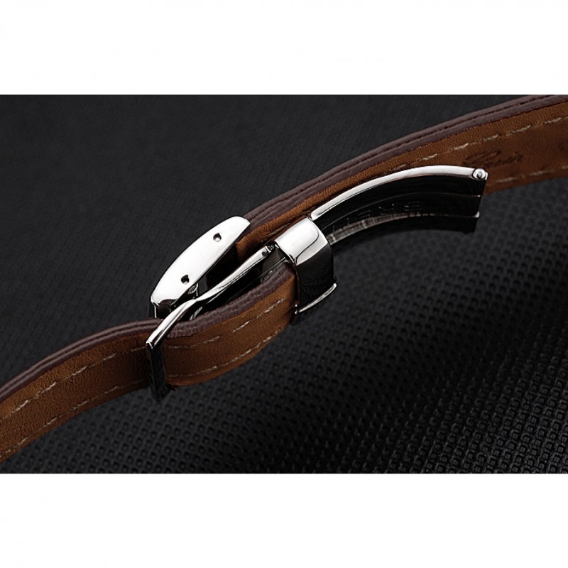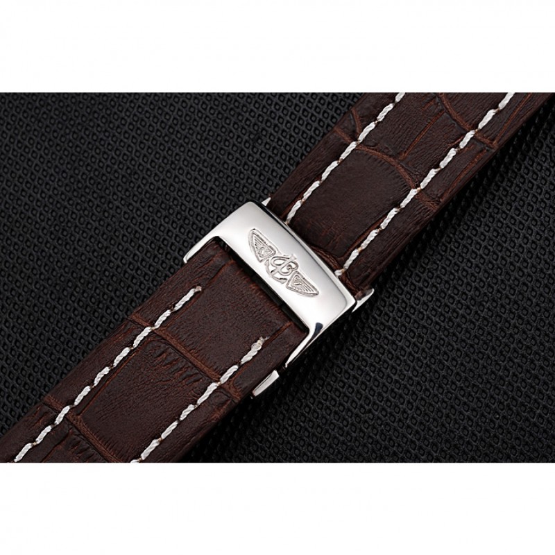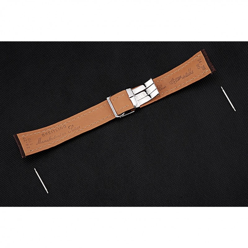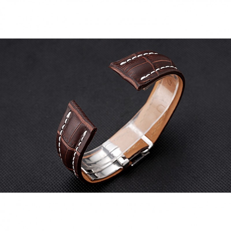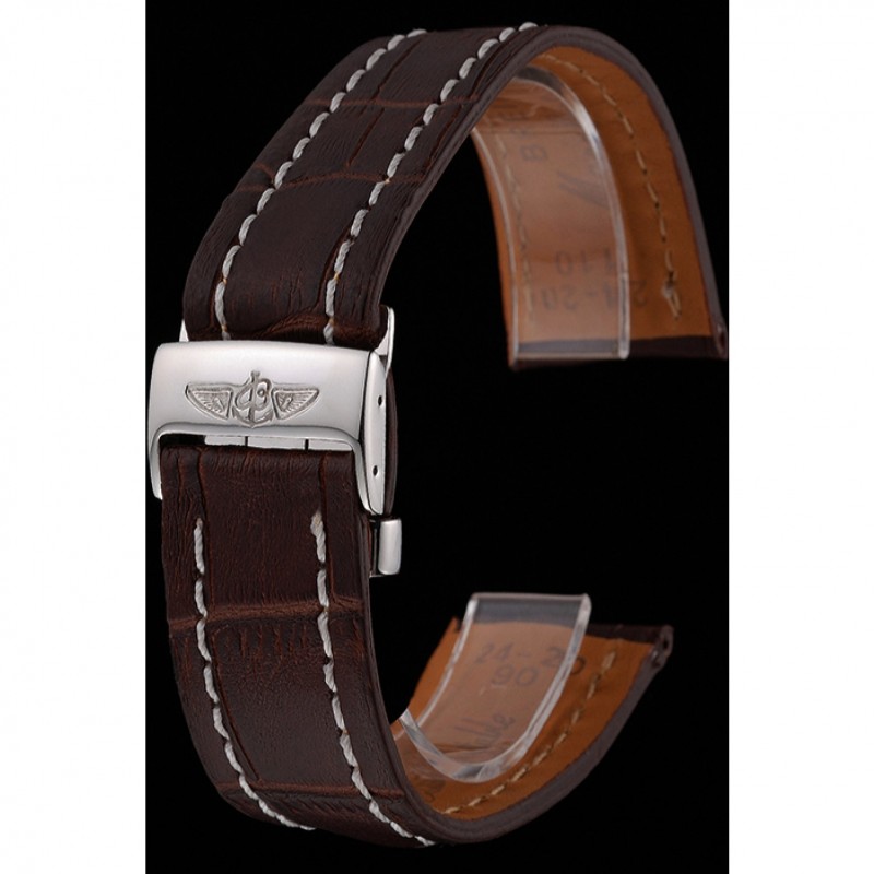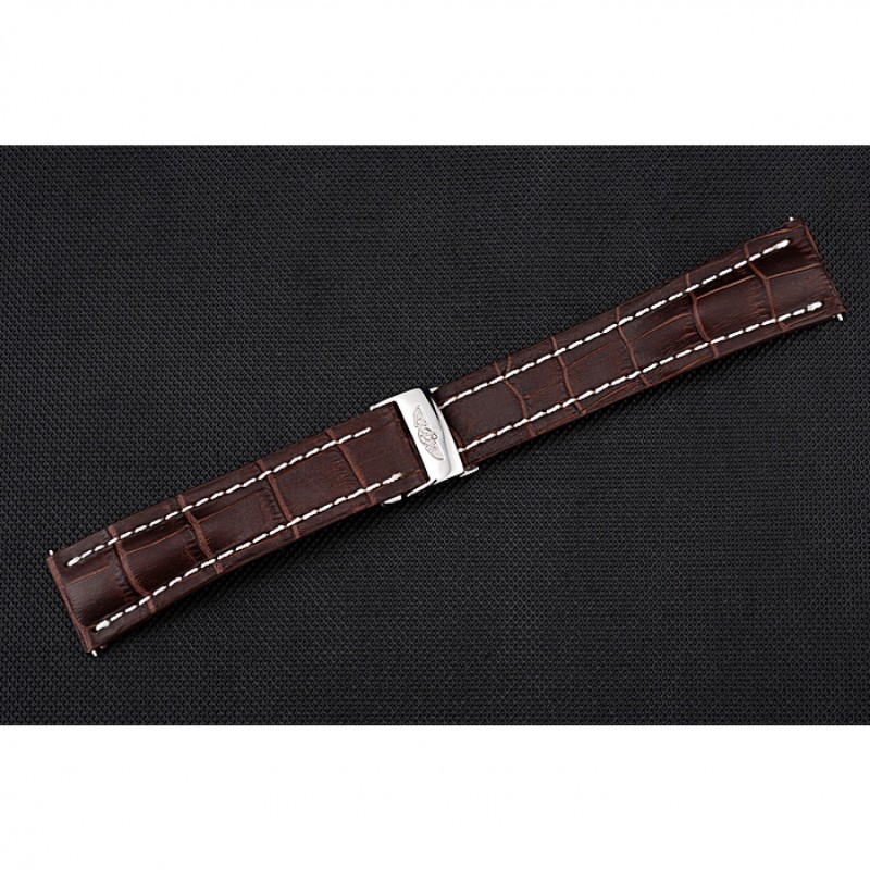 Bracciale: Breitling Fabbricazione en Suisse e calore codice prodotto impresso cinturino in pelle di coccodrillo marrone con cuciture bianche filo e Breitling logo inciso in acciaio inox lucido fold-in chiusura