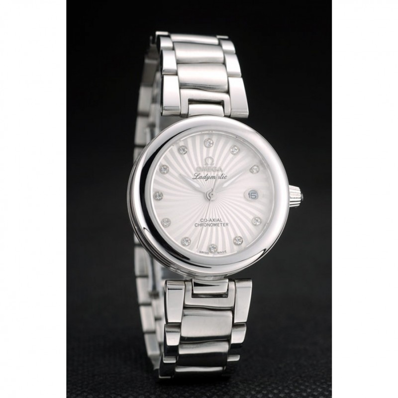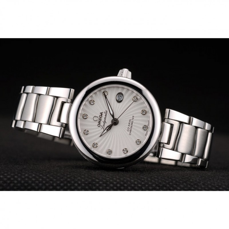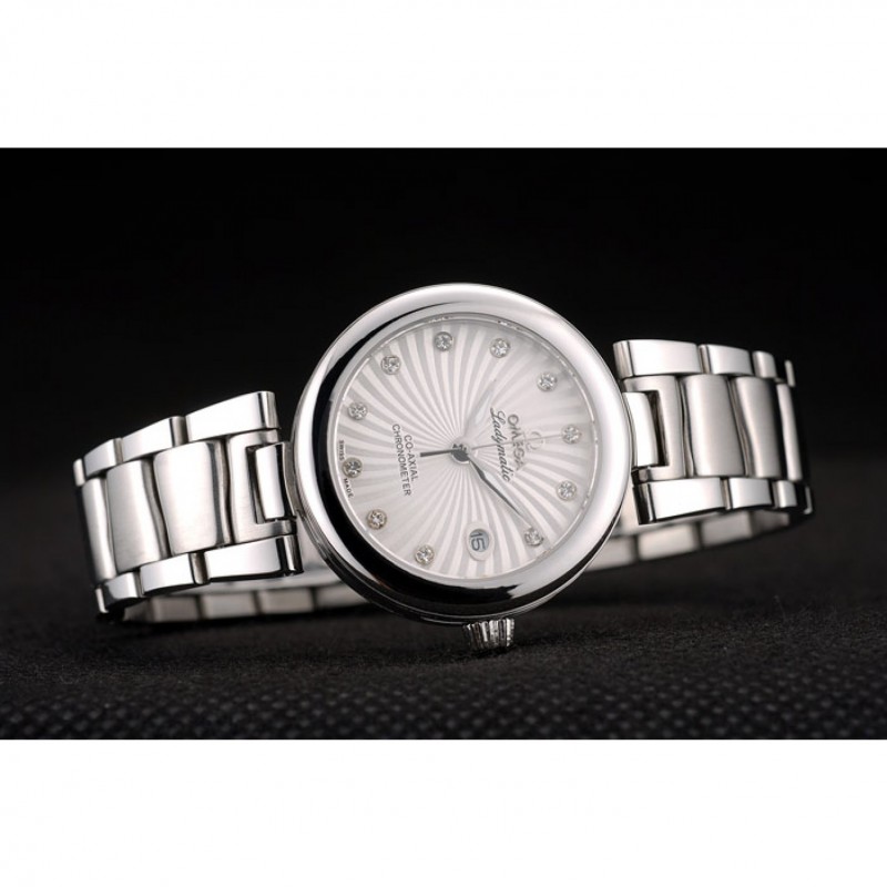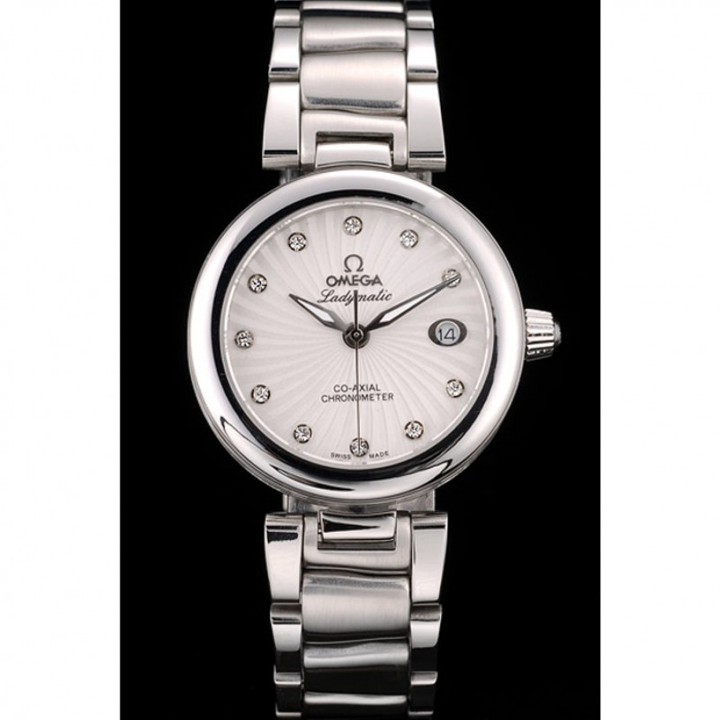 Quadrante cinturino Omega DeVille Ladymatic in acciaio inossidabile bianco.