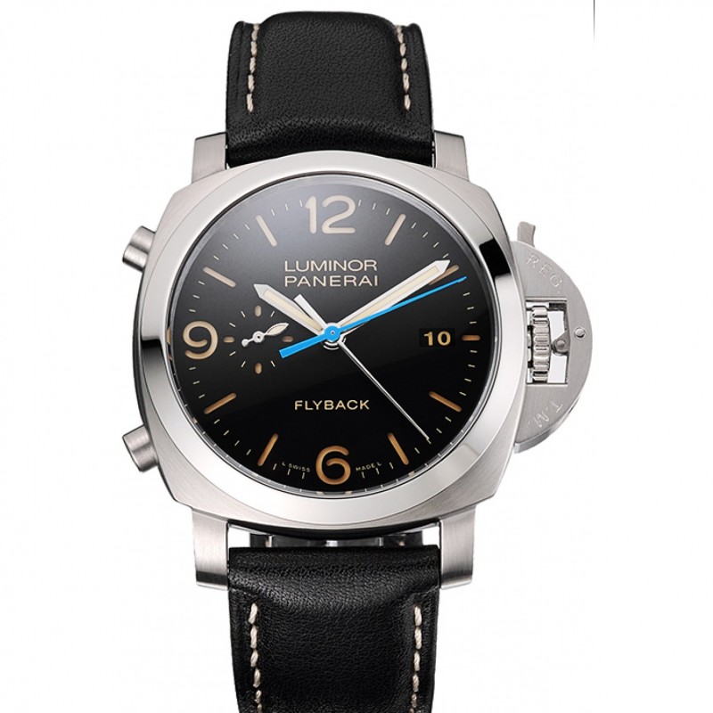 Svizzero Panerai Luminor Flyback Chronograph quadrante nero Cassa in acciaio nero cinturino in pelle