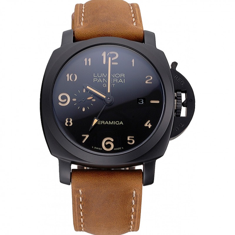 Svizzero Panerai Luminor GMT Ceraica quadrante nero Caso Marrone Nero cinturino in pelle